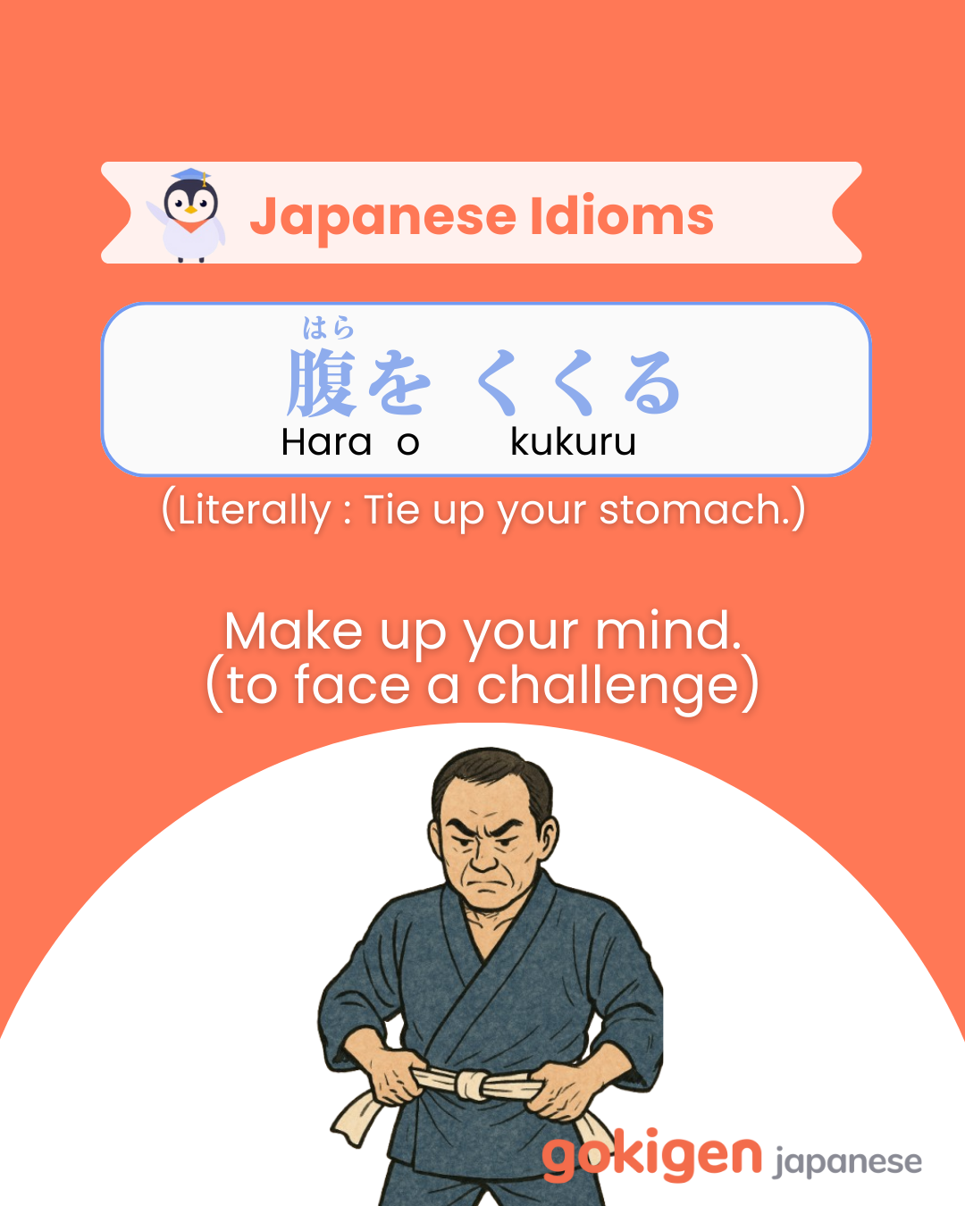 Meaning The phrase “腹はらを括くくる” (Tie up your stomach) means to brace yourself or to make up your mind to face a difficult or unavoidable... Read more.