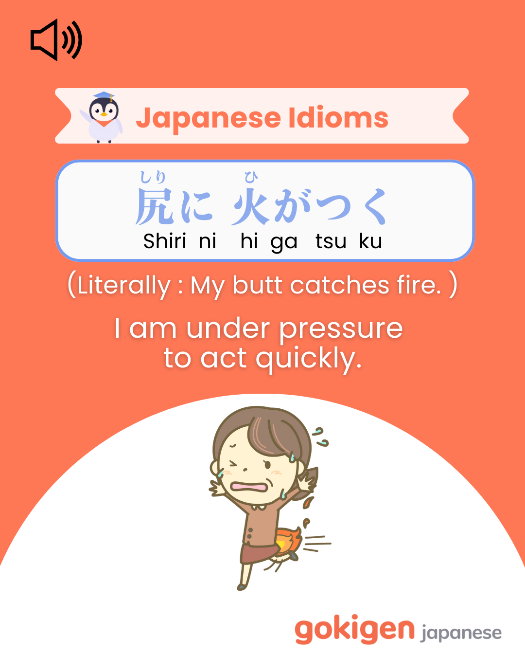 [Japanese idioms] 尻に火がつく (shiri ni hi ga tsuku) – I am under pressure to act quickly