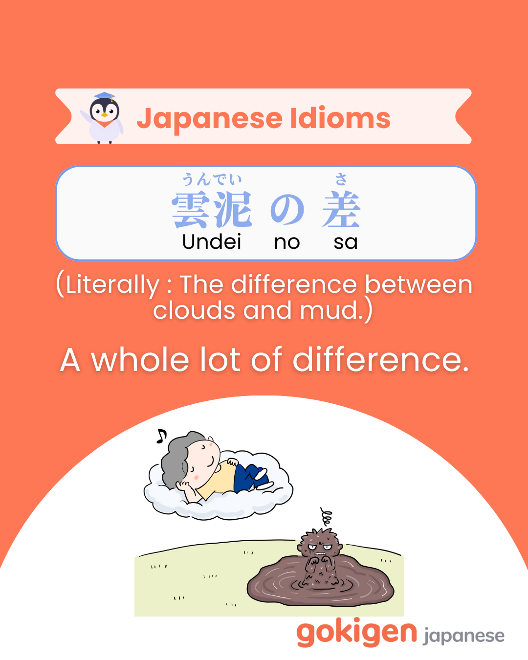 Meaning The phrase “雲泥うんでいの差さ” (The difference between clouds and mud.) refers to a vast difference, a stark contrast, or an insurmountable... Read more.